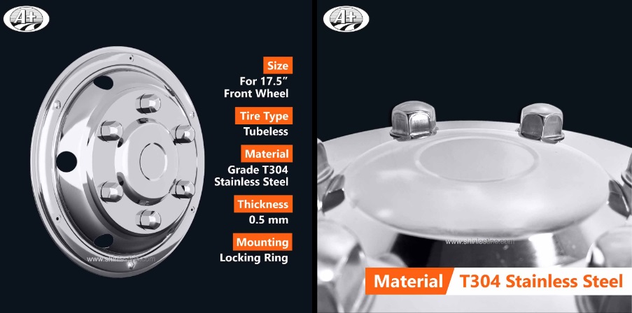 The wheel cover is made of a high-quality 304 stainless steel, which has the highest rating of resistance to both rust and corrosion. All of the pieces have been mirror-polished prior to leaving the factory. The item is one of the best investments/upgrades for your heavy-duty semi or long-haul trucks. Our package comes with a 1-year warranty. Please buy with confidence.