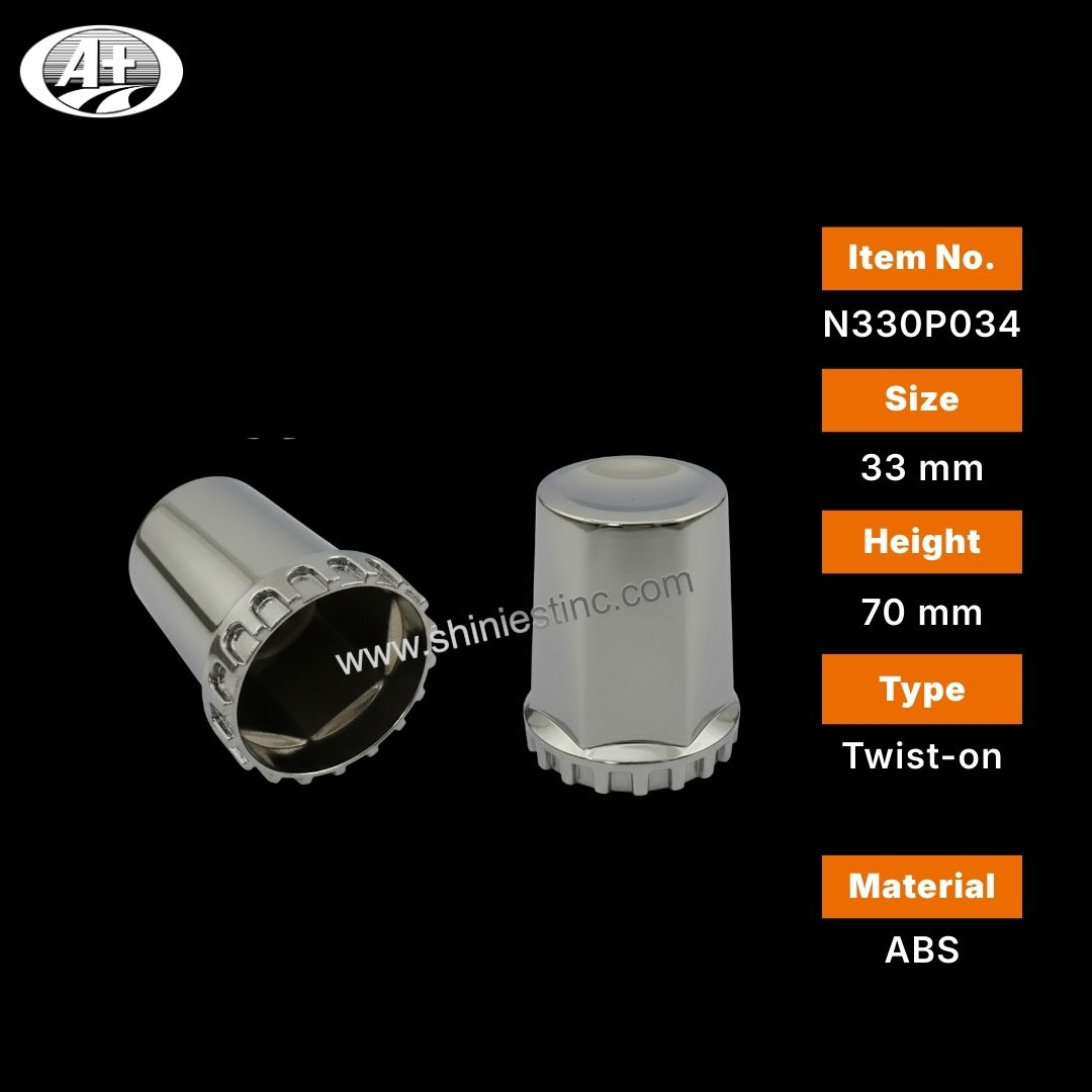 A1: The 33mm Lug Nut Cover is the standard size for modern "Hub Pilot" wheel systems used on most heavy-duty trucks (22.5" and 24.5" wheels). If your truck uses a single nut per stud (with a built-in washer), it is likely a 33mm nut. We recommend measuring the nut across the flats using a socket or caliper to confirm before ordering.